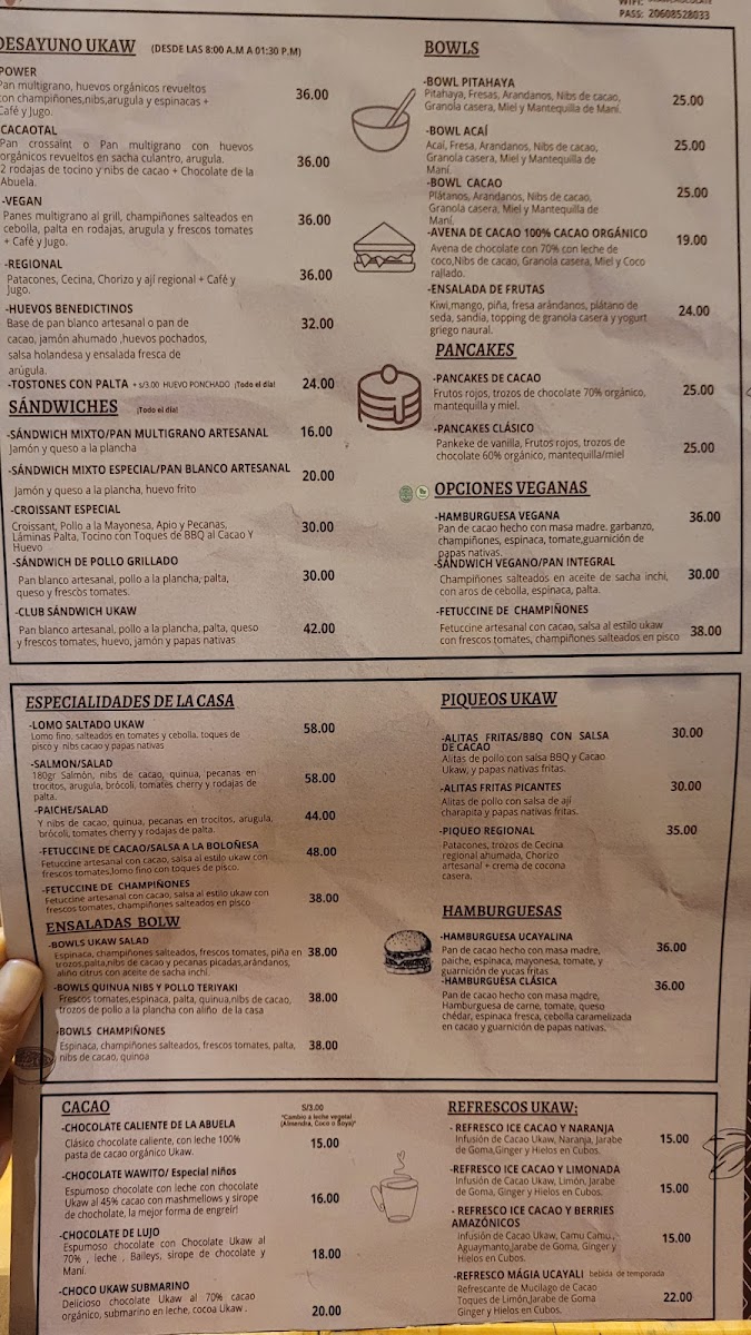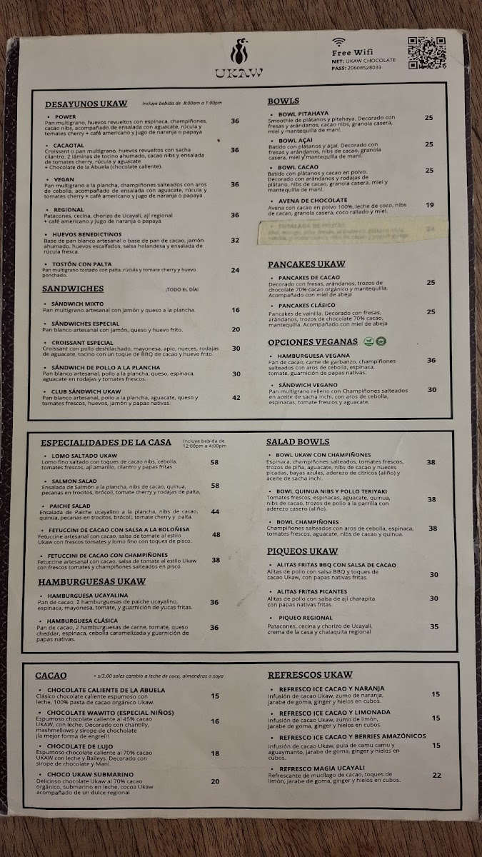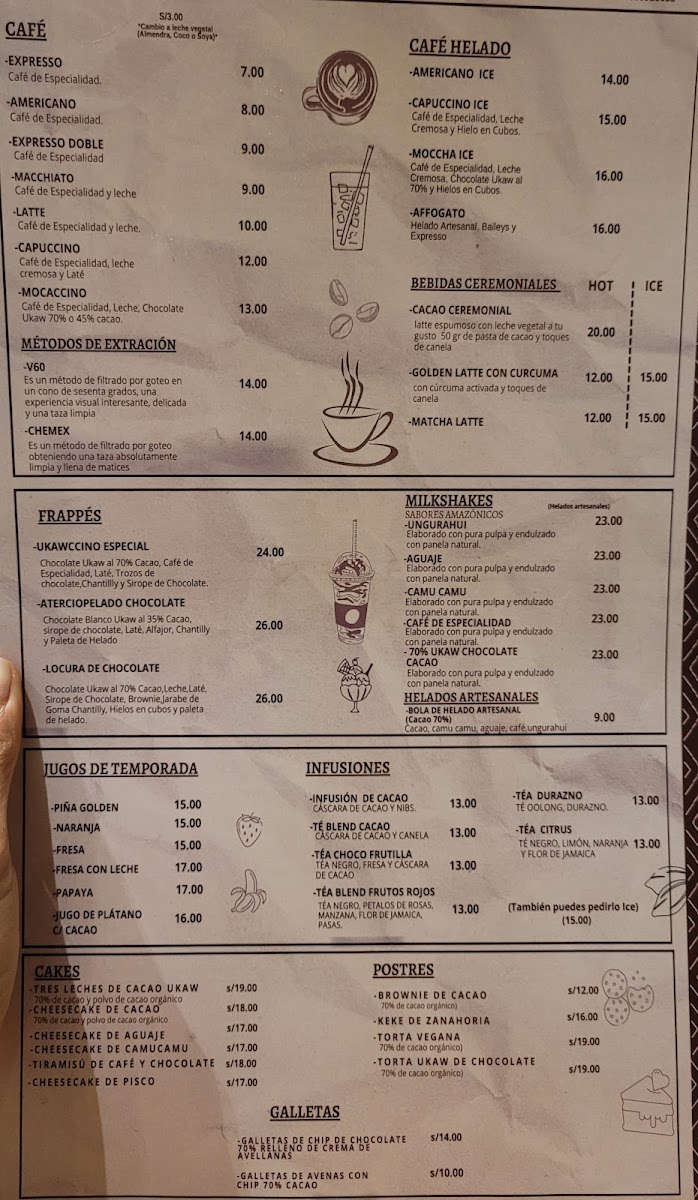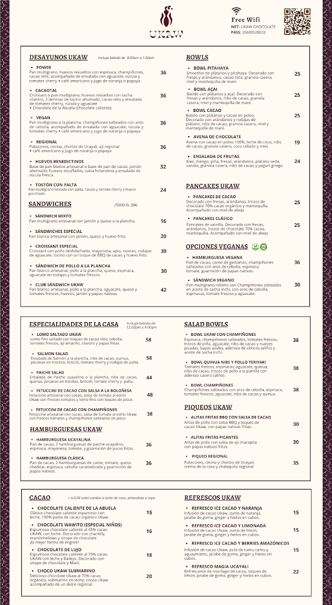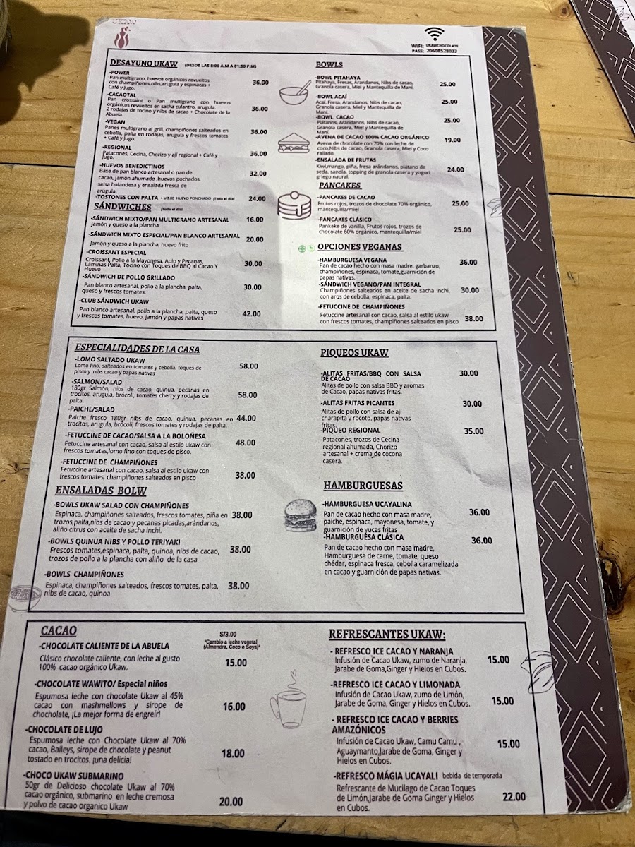From a reviewer’s perspective, the menu at Ukaw Chocolate offers a creative cacao-focused selection that blends traditional comfort foods with chocolate-inspired specialties. Seasonal items like Panetón Ukaw Chocolatoso Al 45% Cacao Con Leche, Dúo Navideño, and Panetón Ukaw Vegano Al 60% Cacao highlight their artisanal chocolate theme, while refreshing drinks such as Refresco Ice Cacao Limonada, Milkshakes De Ungurahui, Milkshakes De Cacao 70% Ice Cacao Y Berries Amazónicos, and Frappe Ukawchino Especial provide unique cold beverage options. The hot drinks menu features comforting choices like Café Capuccino 240 Ml, Chocolate De Lujo 320ml, Chocolate Wawito, Café Americano, and Chocolate De La Abuela 320ml. For more filling meals, the restaurant offers Hamburguesa Ucayalina, Hamburguesa Vegana, and Hamburguesa Clásica, as well as breakfast sets such as Desayuno Regional, Desayuno Vegan, Desayuno Cacaotal, and Desayuno Power. Dessert lovers can enjoy Cake De Zanahoria, Brownie De Cacao, Tiramisu De Cafe Y Chocolate, Cheesecake De Camu Camu, and Cheesecake De Cacao, while healthier options include Bowl De Cacao, Bowl De Acai, and Avena De Cacao 100% Cacao Orgánico. The lunch menu stands out with savory dishes like Alitas A La BBQ Con Salsa De Cacao, Alitas Fritas Picantes, Bowl De Quinua Nibs Y Pollo Teruyaki, Salmon Salad, and Fetuccini De Cacao En Salsa A La Boloñesa. Additionally, visitors can purchase gifts such as Tableta De Chocolate Mango Y Maracuya 45%, Tableta De Piña Y Coco Al 70% Cacao, Chocolate Al 100% Cacao, Tableta De Chocolate Con Sal Y Nibs 60%, and Bombones Macizos, along with special offers like Promo Plus - Torta Ukaw 70% and light bites including Sándwich Vegano En Pan Integral, Croissant Clásico, Croissant Especial, and Croissant Selva Gourmet, making the menu diverse, cacao-centered, and appealing for both casual visits and chocolate enthusiasts.