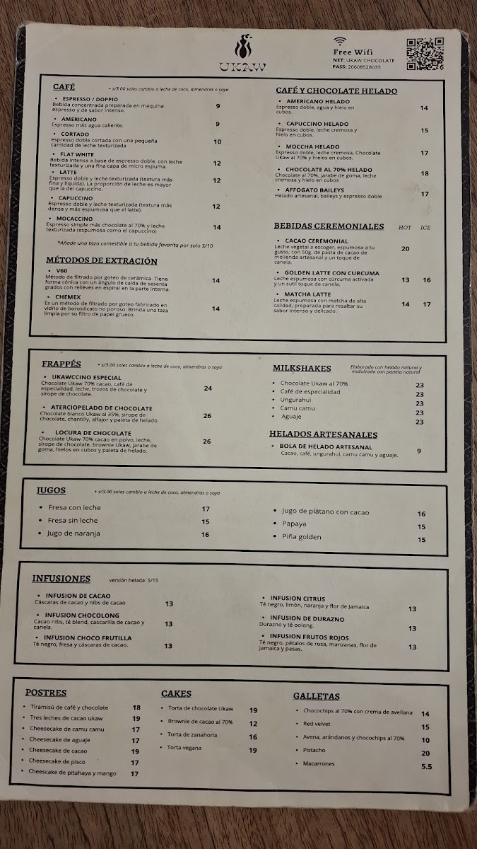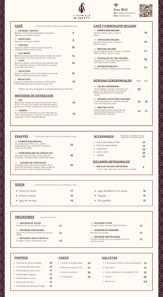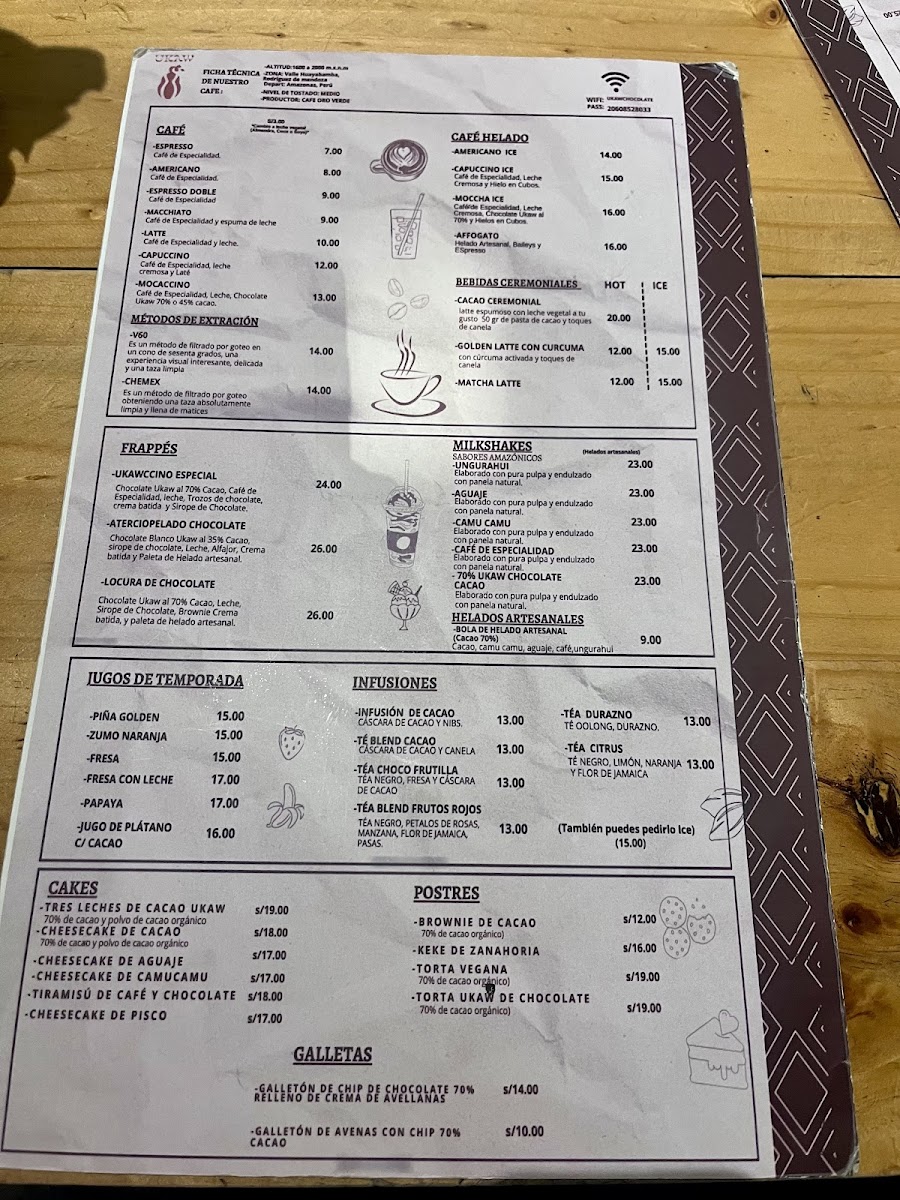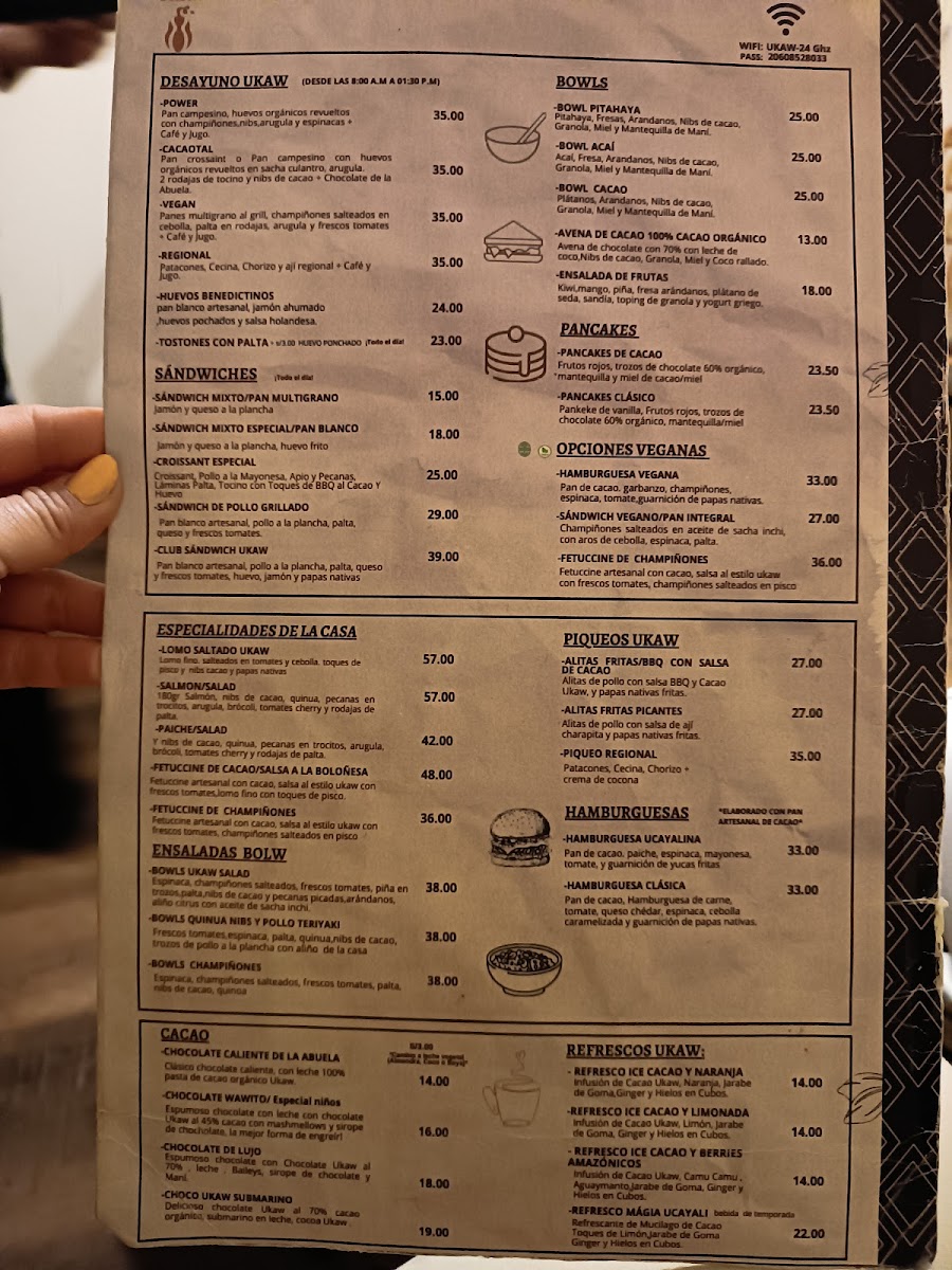 From a reviewer’s perspective, the menu at Ukaw Chocolate offers a creative cacao-focused selection that blends traditional comfort foods with chocolate-inspired specialties. Seasonal items like Panetón Ukaw Chocolatoso Al 45% Cacao Con Leche, Dúo Navideño, and Panetón Ukaw Vegano Al 60% Cacao highlight their artisanal chocolate theme, while refreshing drinks such as Refresco Ice Cacao Limonada, Milkshakes De Ungurahui, Milkshakes De Cacao 70% Ice Cacao Y Berries Amazónicos, and Frappe Ukawchino Especial provide unique cold beverage options. The hot drinks menu features comforting choices like Café Capuccino 240 Ml, Chocolate De Lujo 320ml, Chocolate Wawito, Café Americano, and Chocolate De La Abuela 320ml. For more filling meals, the restaurant offers Hamburguesa Ucayalina, Hamburguesa Vegana, and Hamburguesa Clásica, as well as breakfast sets such as Desayuno Regional, Desayuno Vegan, Desayuno Cacaotal, and Desayuno Power. Dessert lovers can enjoy Cake De Zanahoria, Brownie De Cacao, Tiramisu De Cafe Y Chocolate, Cheesecake De Camu Camu, and Cheesecake De Cacao, while healthier options include Bowl De Cacao, Bowl De Acai, and Avena De Cacao 100% Cacao Orgánico. The lunch menu stands out with savory dishes like Alitas A La BBQ Con Salsa De Cacao, Alitas Fritas Picantes, Bowl De Quinua Nibs Y Pollo Teruyaki, Salmon Salad, and Fetuccini De Cacao En Salsa A La Boloñesa. Additionally, visitors can purchase gifts such as Tableta De Chocolate Mango Y Maracuya 45%, Tableta De Piña Y Coco Al 70% Cacao, Chocolate Al 100% Cacao, Tableta De Chocolate Con Sal Y Nibs 60%, and Bombones Macizos, along with special offers like Promo Plus - Torta Ukaw 70% and light bites including Sándwich Vegano En Pan Integral, Croissant Clásico, Croissant Especial, and Croissant Selva Gourmet, making the menu diverse, cacao-centered, and appealing for both casual visits and chocolate enthusiasts.